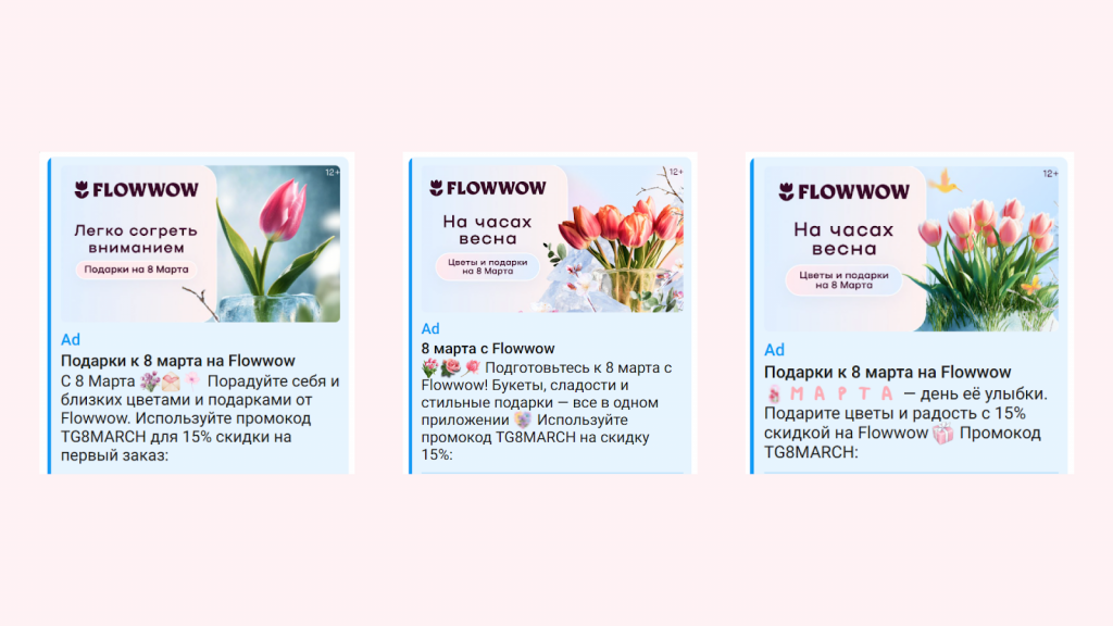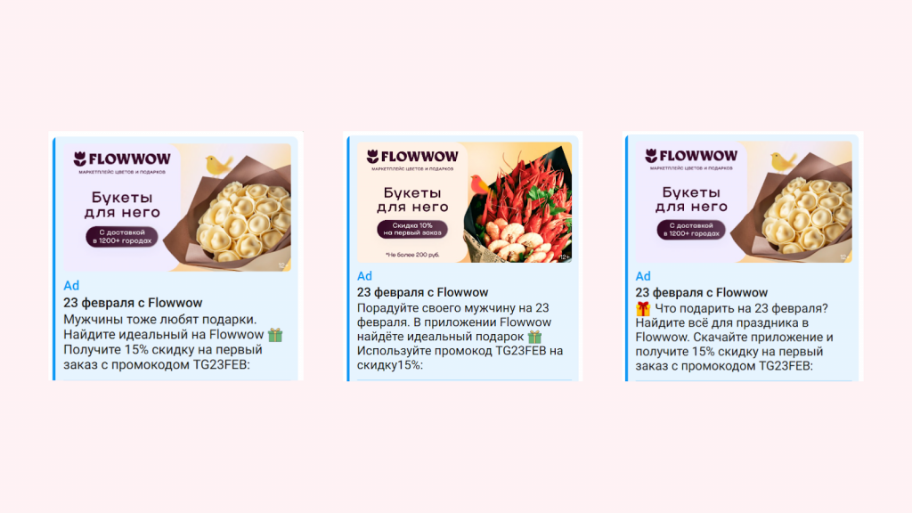На примере рекламных кампаний Flowwow в Telegram Ads, которые команда Dorvey Marketing запускала при нашем партнёрском участии, мы разобрали два отдельных периода — к 23 февраля и к 8 марта — и сравнили их по стоимости, объёму и поведению аудитории.